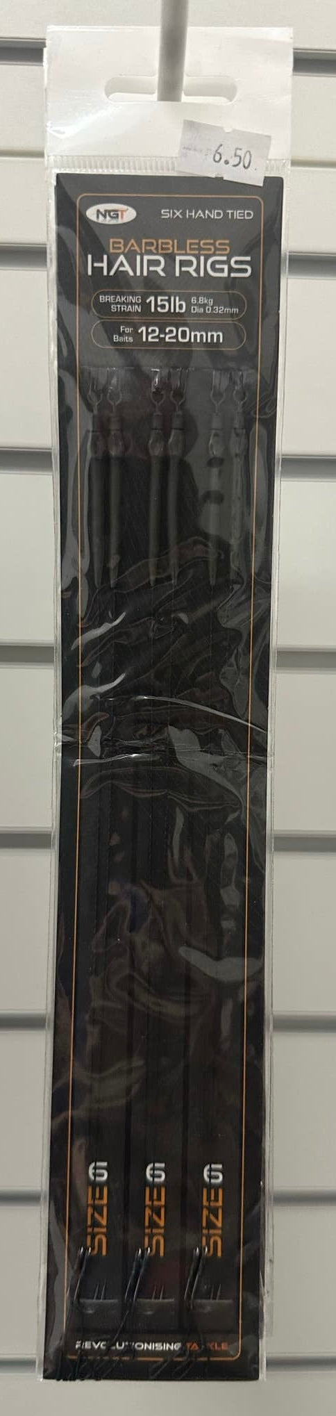 The NGT Barbless Hair Rigs are expertly hand-tied for strength, reliability, and optimal bait presentation. This pack of six features size 6 hooks, making them ideal for carp and coarse fishing.